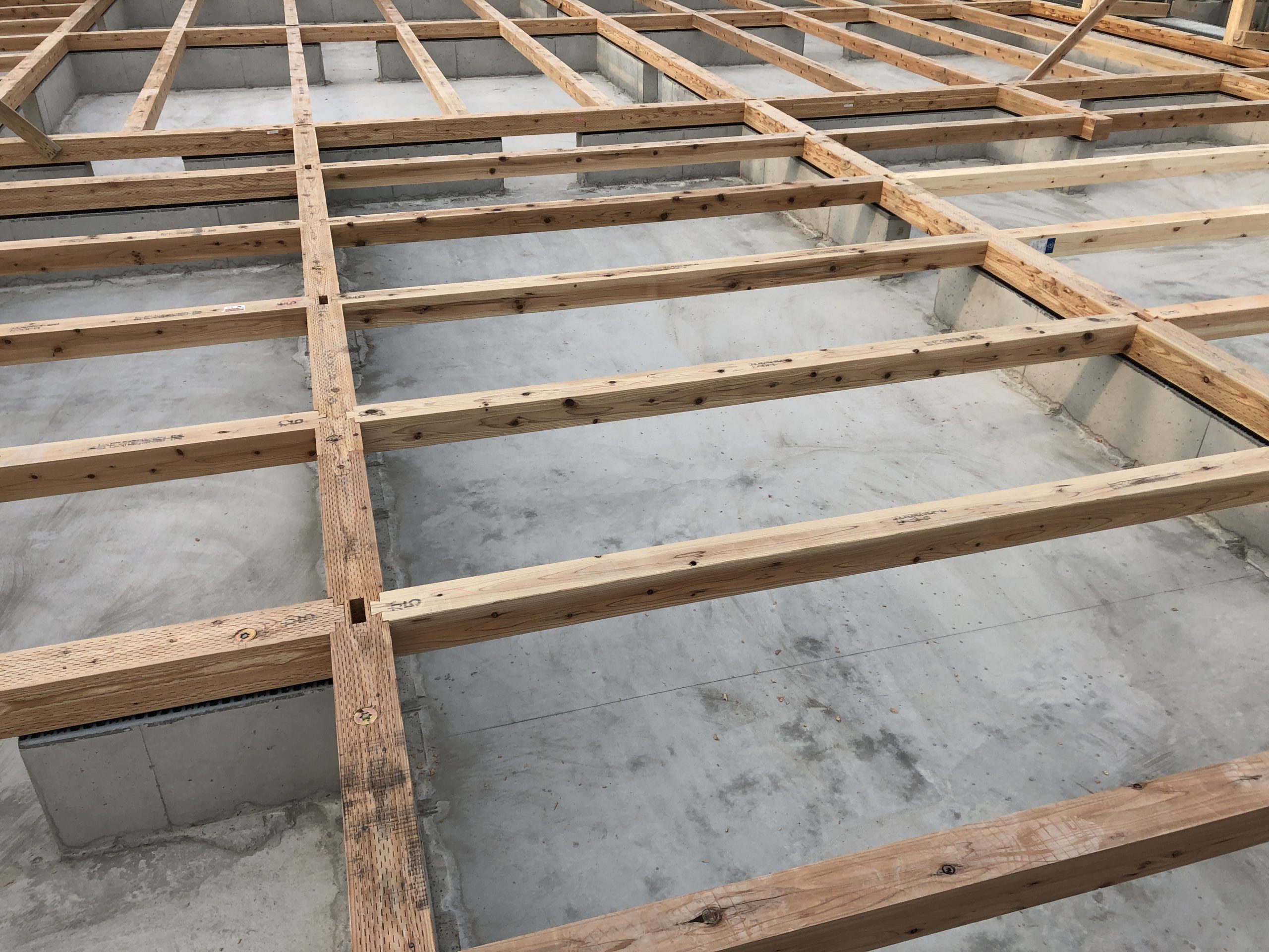 ベタ基礎の上に柱や梁を組み立てて行きます。