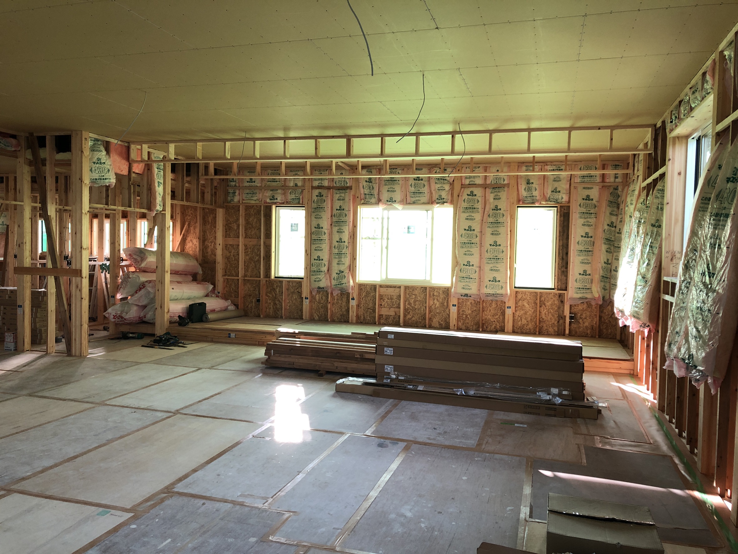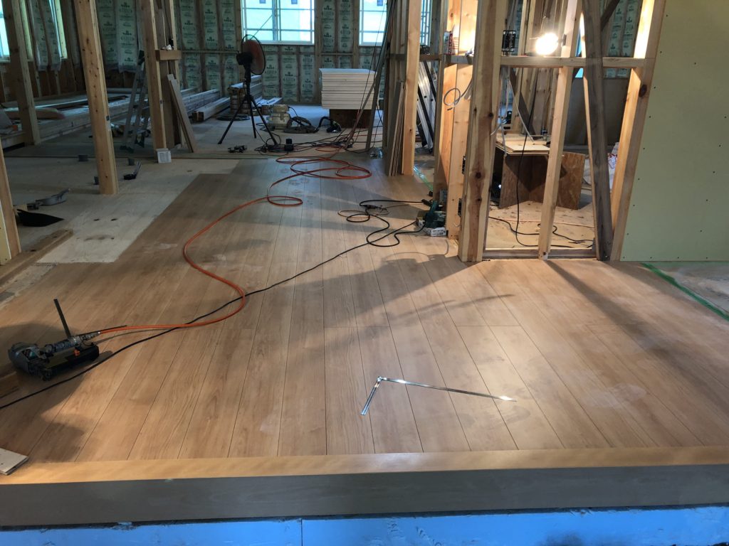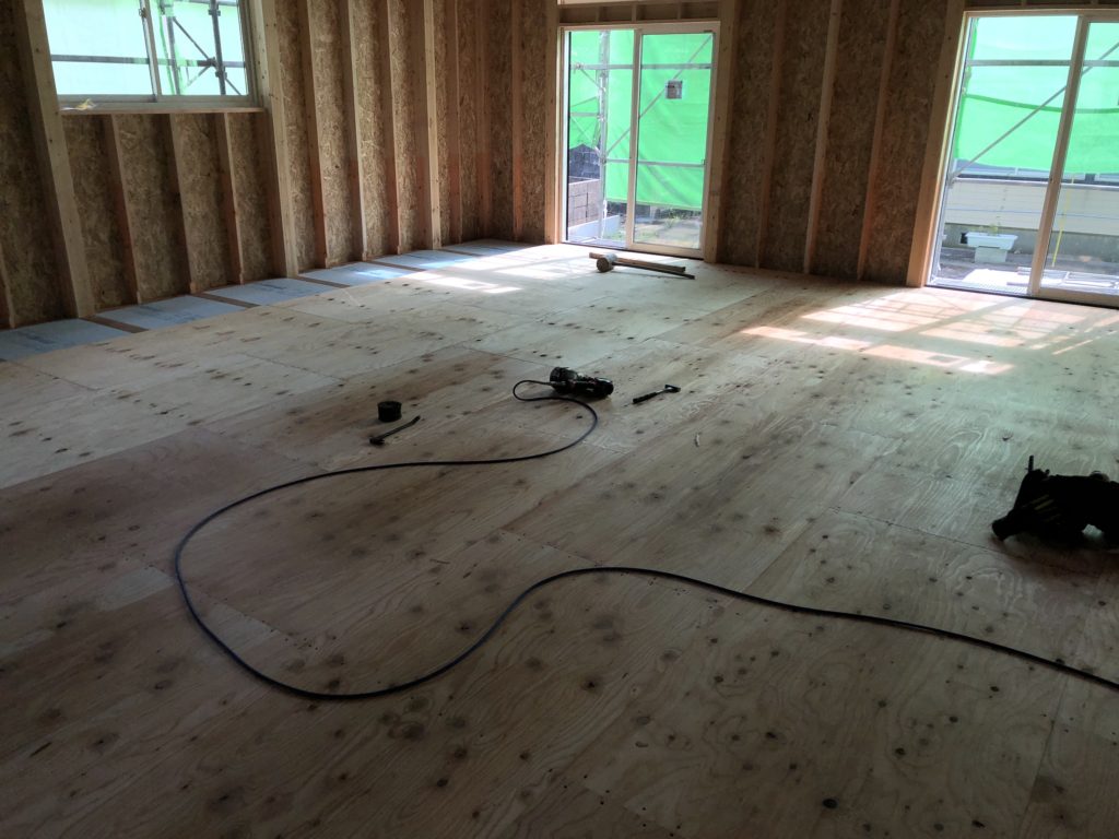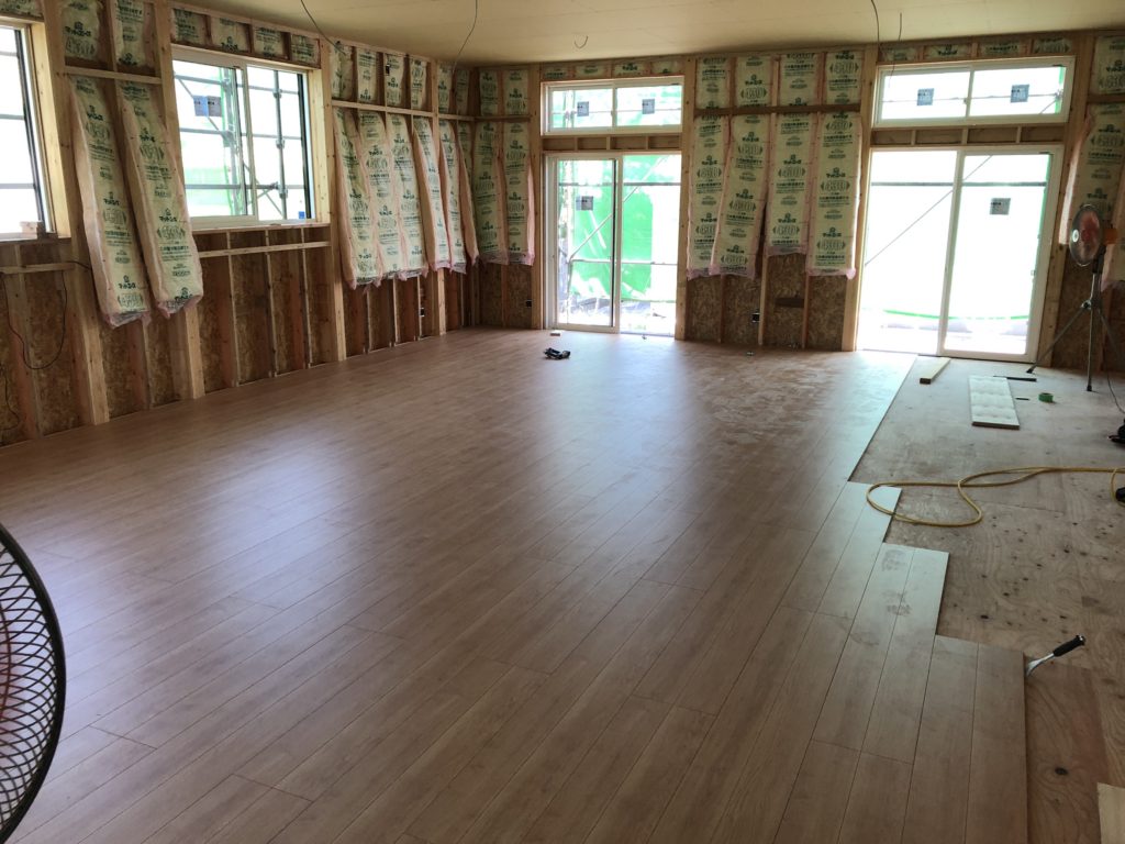 天井・床面の施工と同時に床面のフローリング設置もできるところから行なっていきます。
