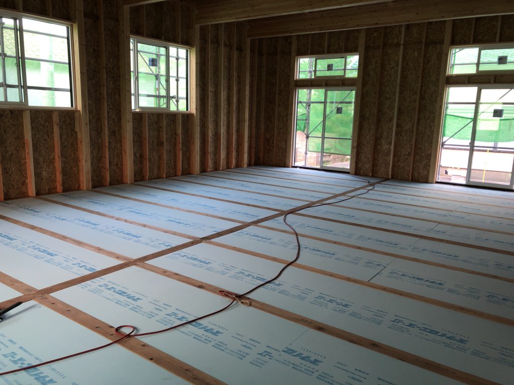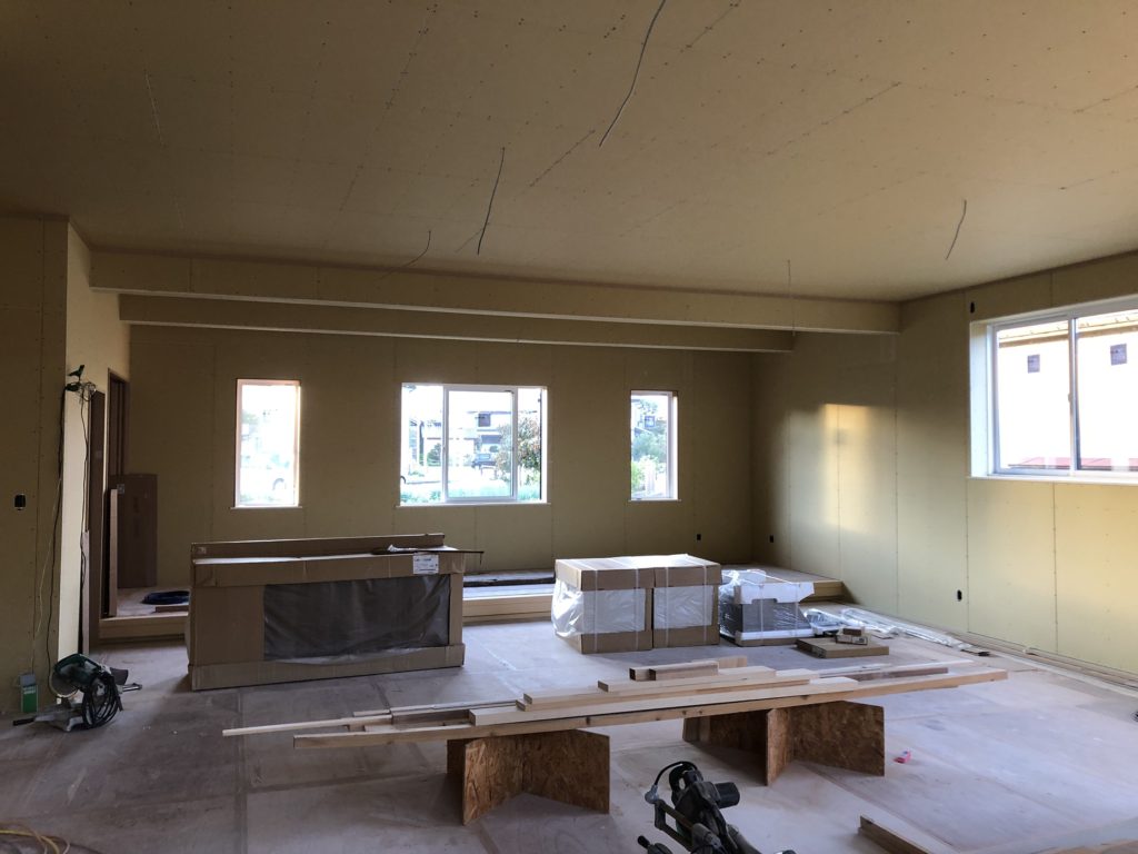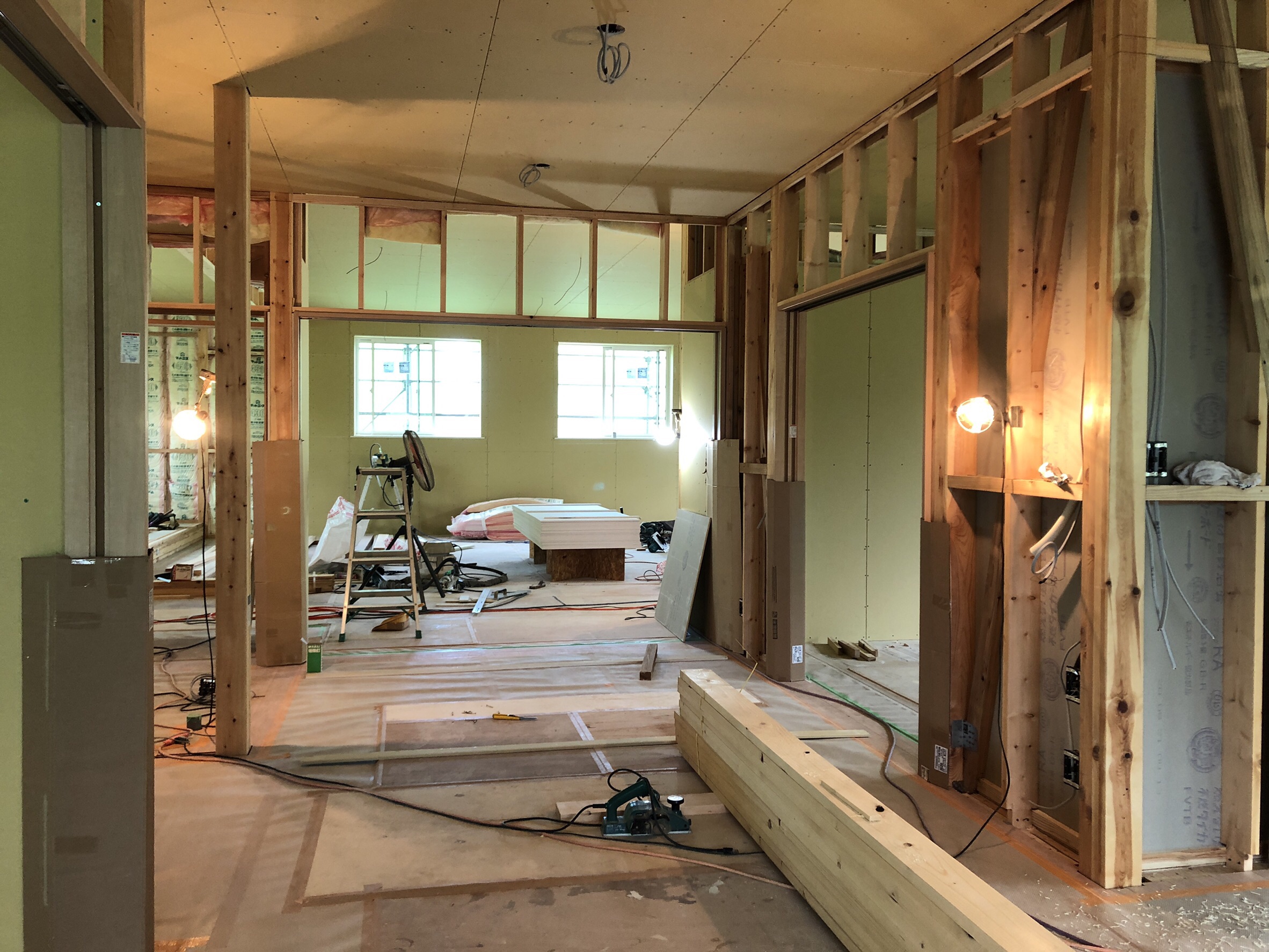 天井・床面の施工と同時に床面のフローリング設置もできるところから行なっていきます。