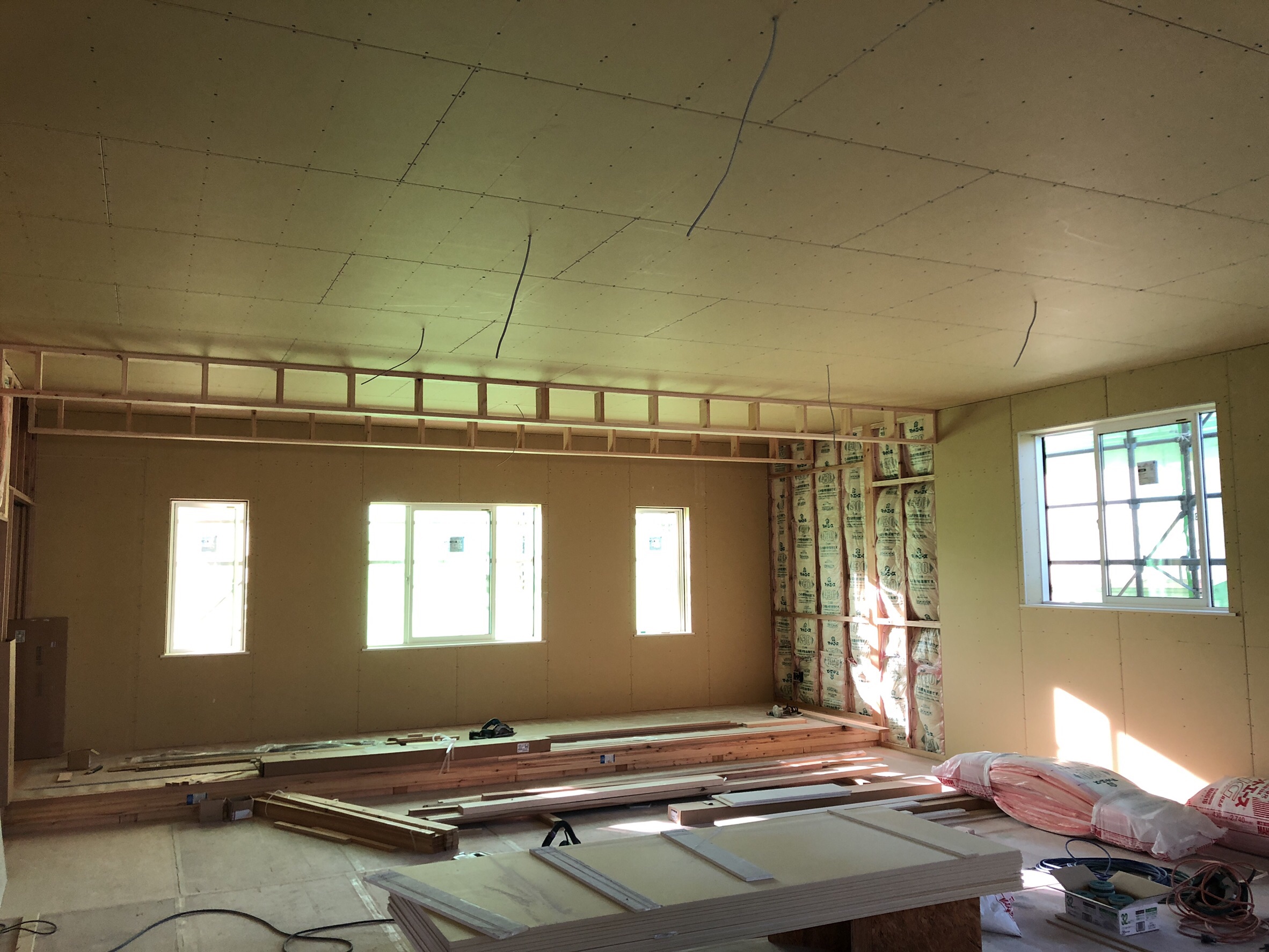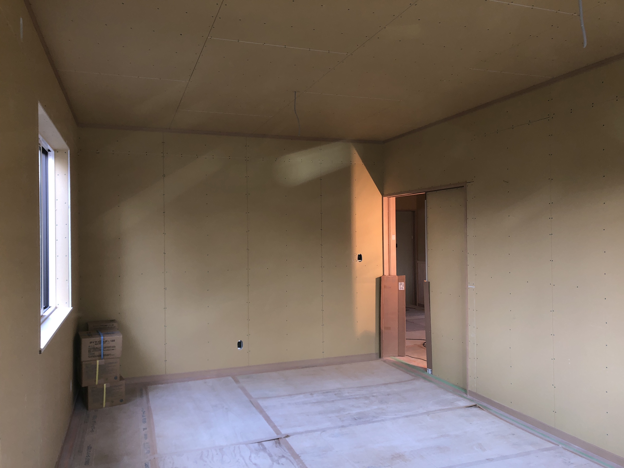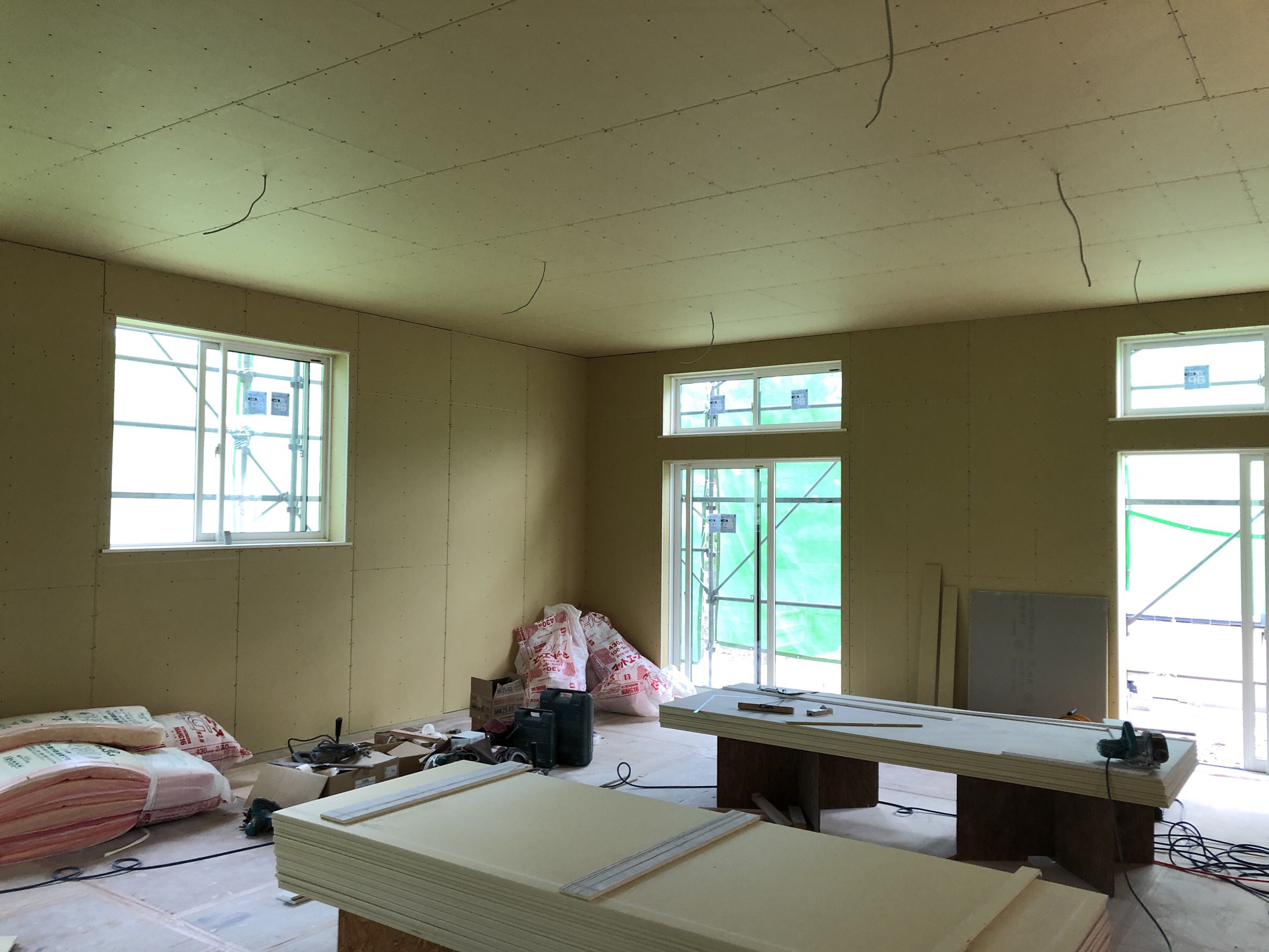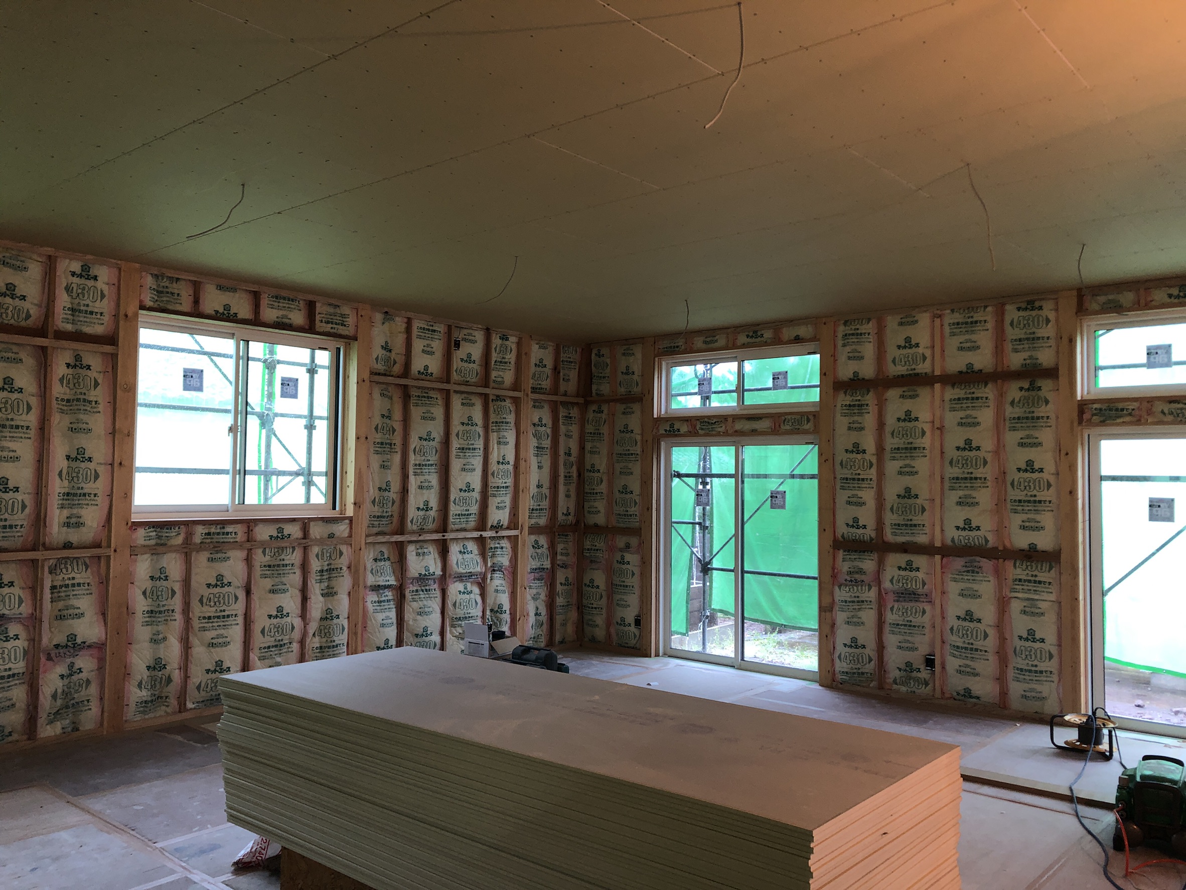 大広間の防湿断熱処理が終わり、石膏ボードでの内壁製作も順調に進んでいます。