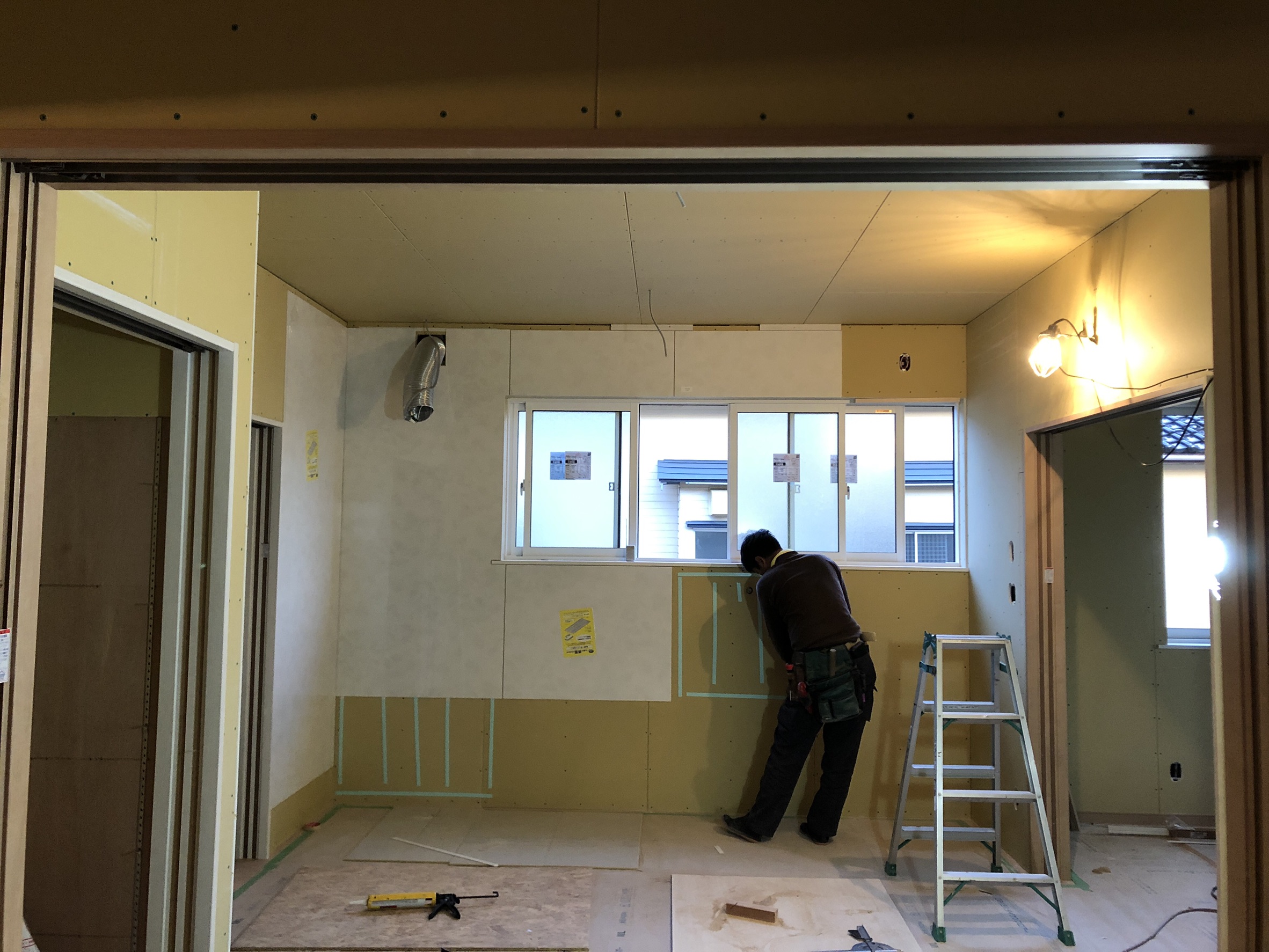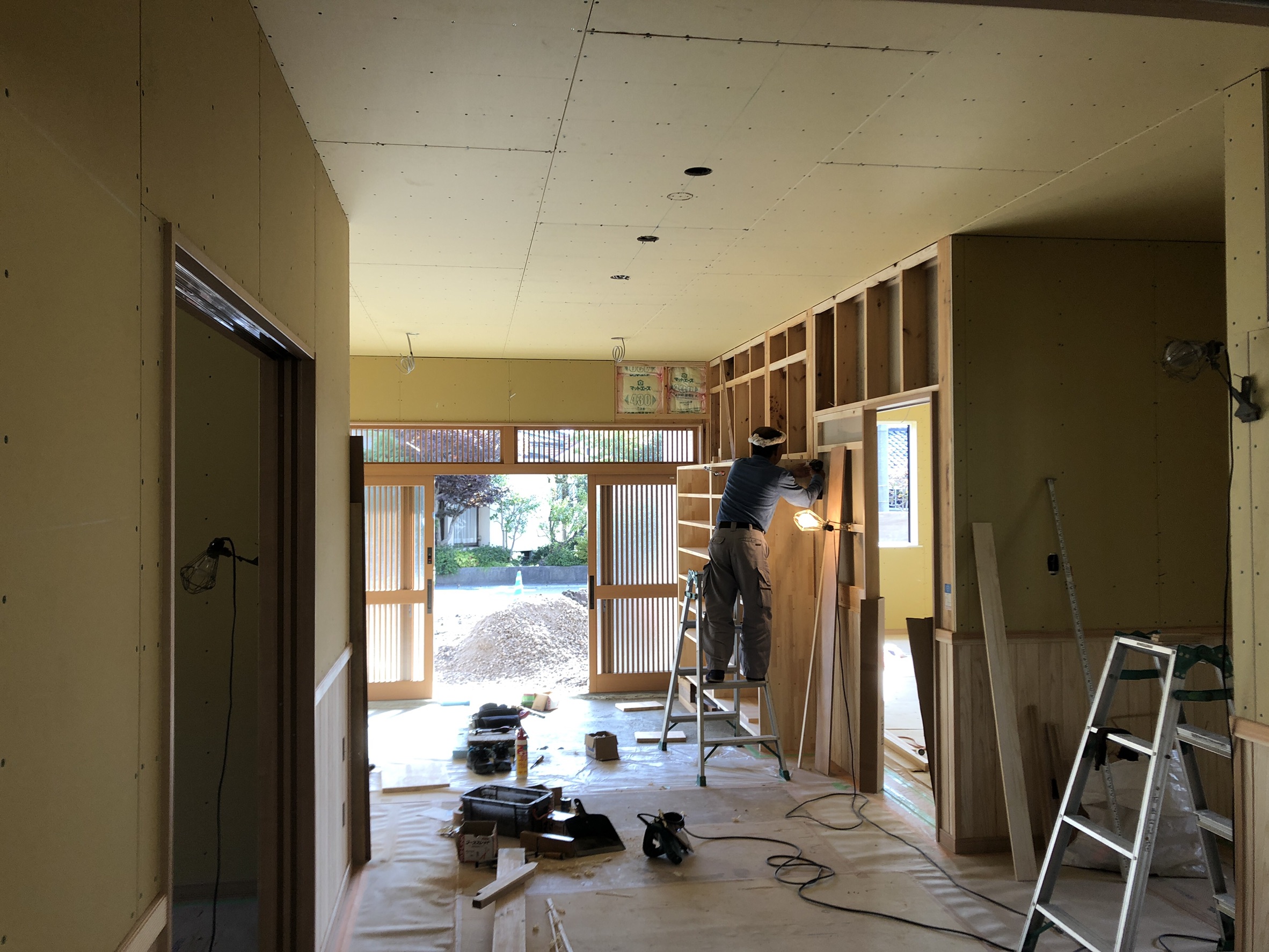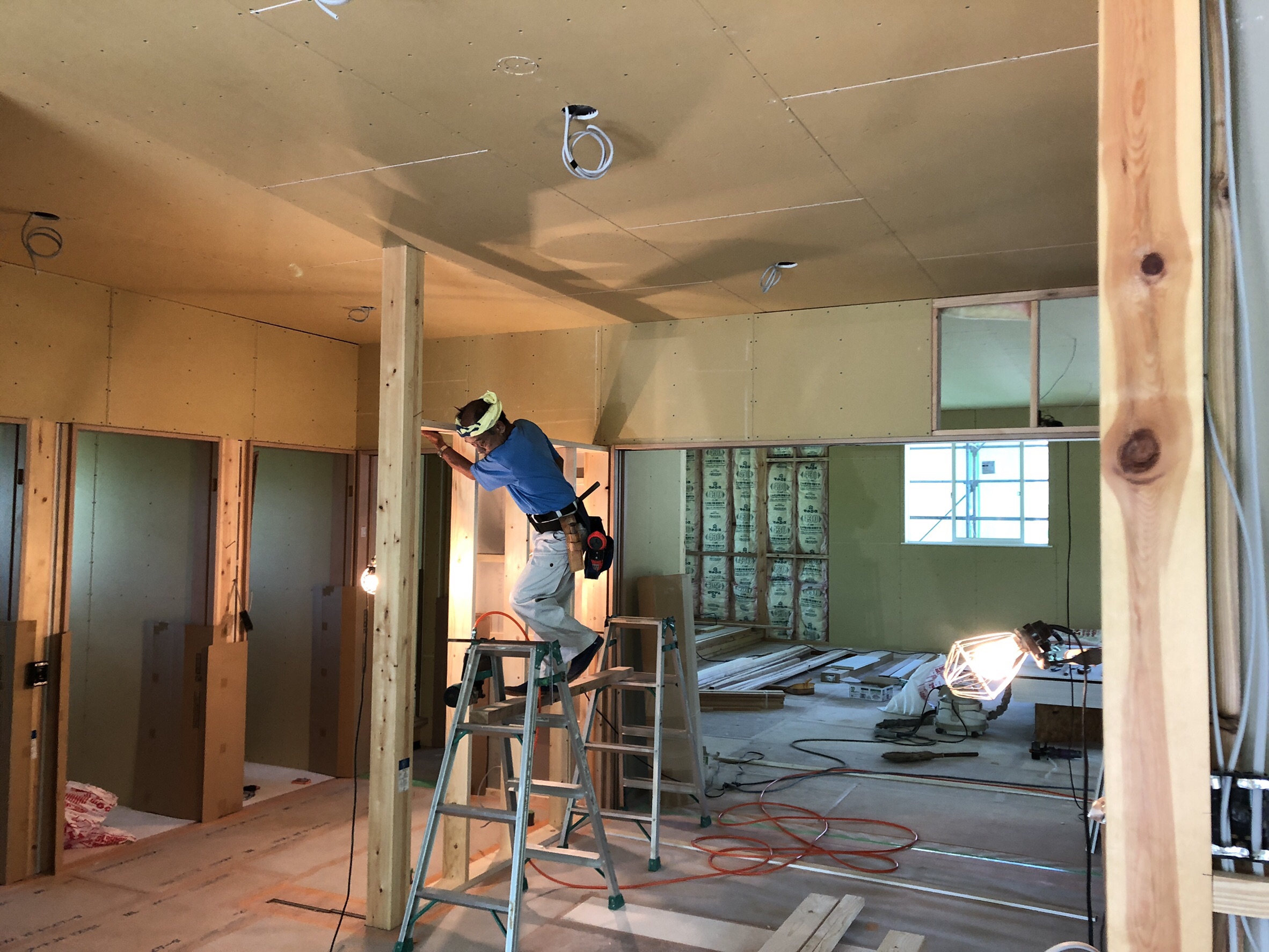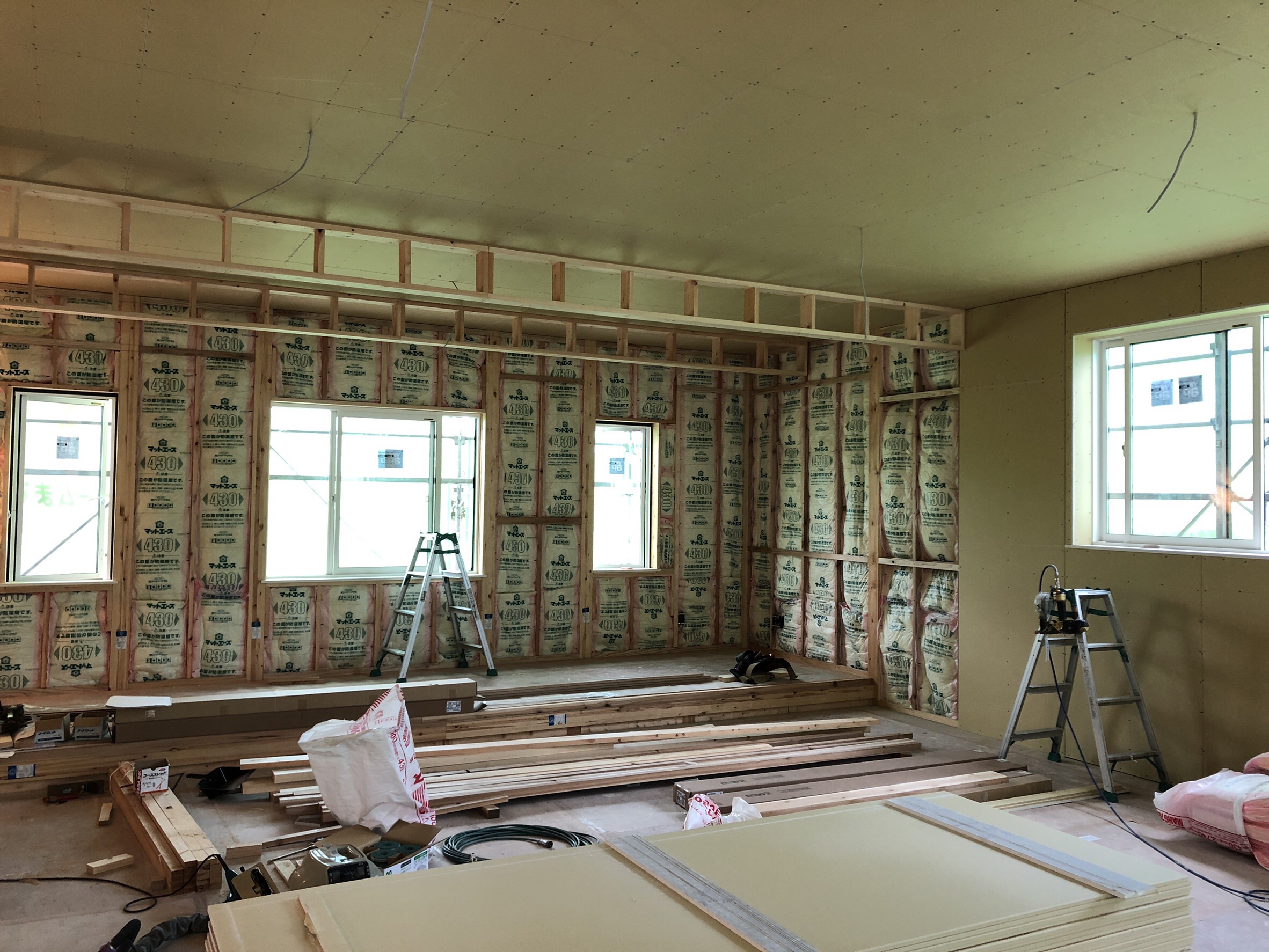 大広間の防湿断熱処理が終わり、石膏ボードでの内壁製作も順調に進んでいます。