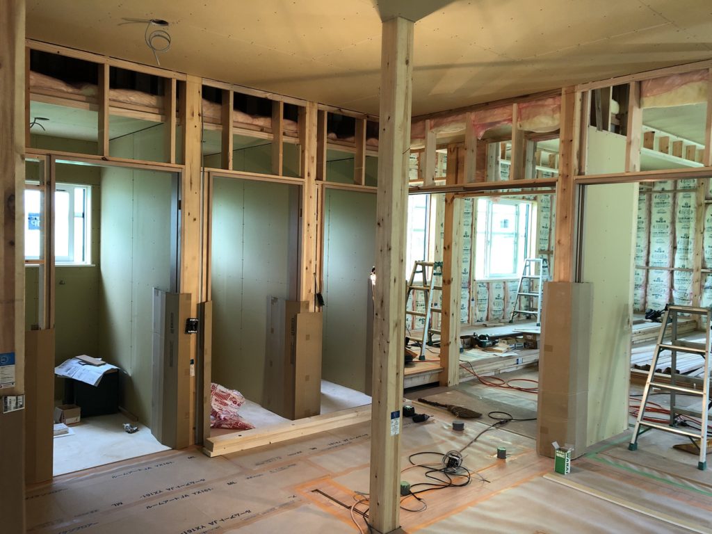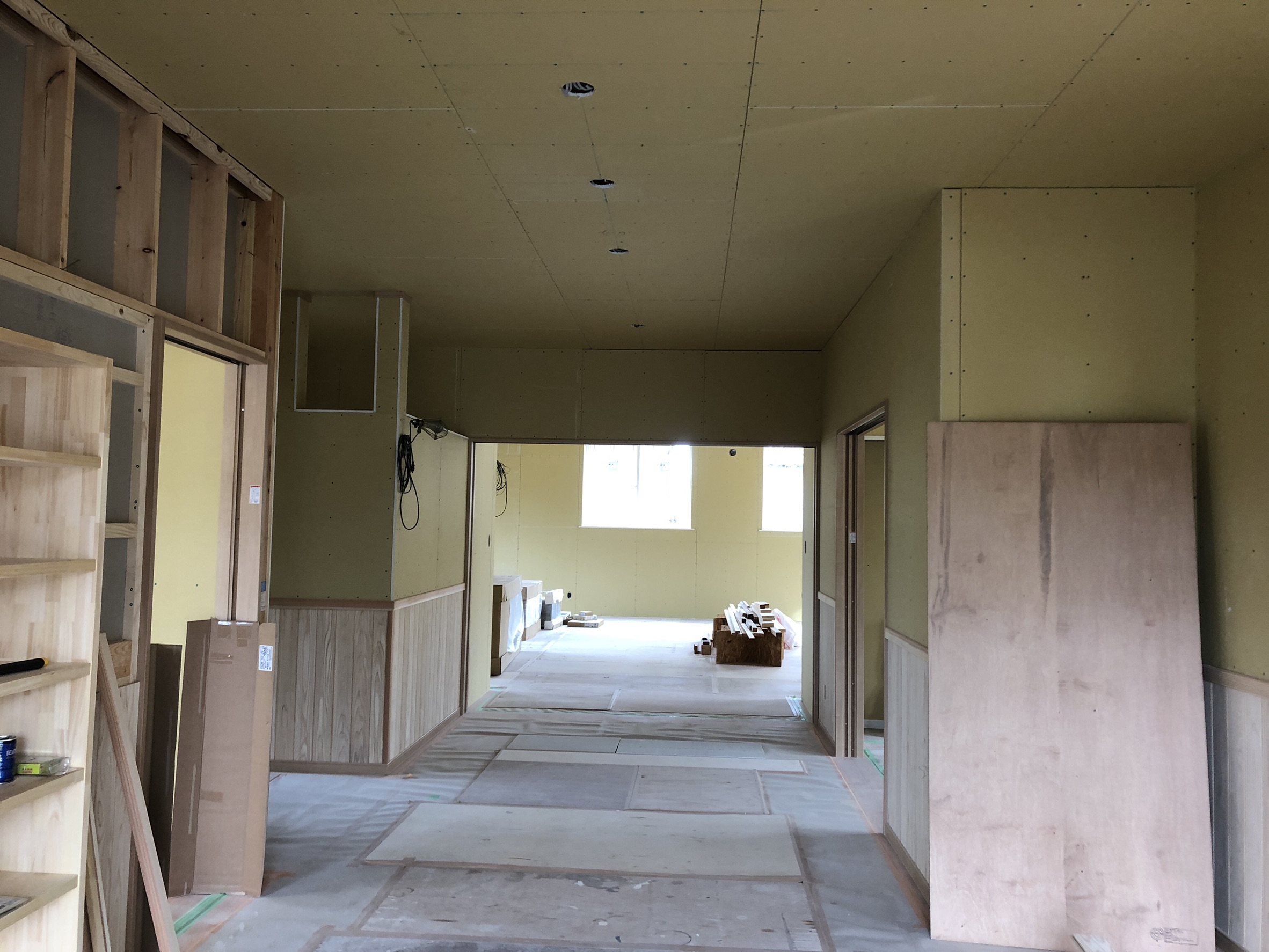内装工事はだいぶ進みました。これからクロス(壁紙)貼り、照明器具取り付け、住宅設備(便器・キッチン等)取り付けを行っていきます。会館の玄関には大人数分が収納できる下駄箱を設置しました。