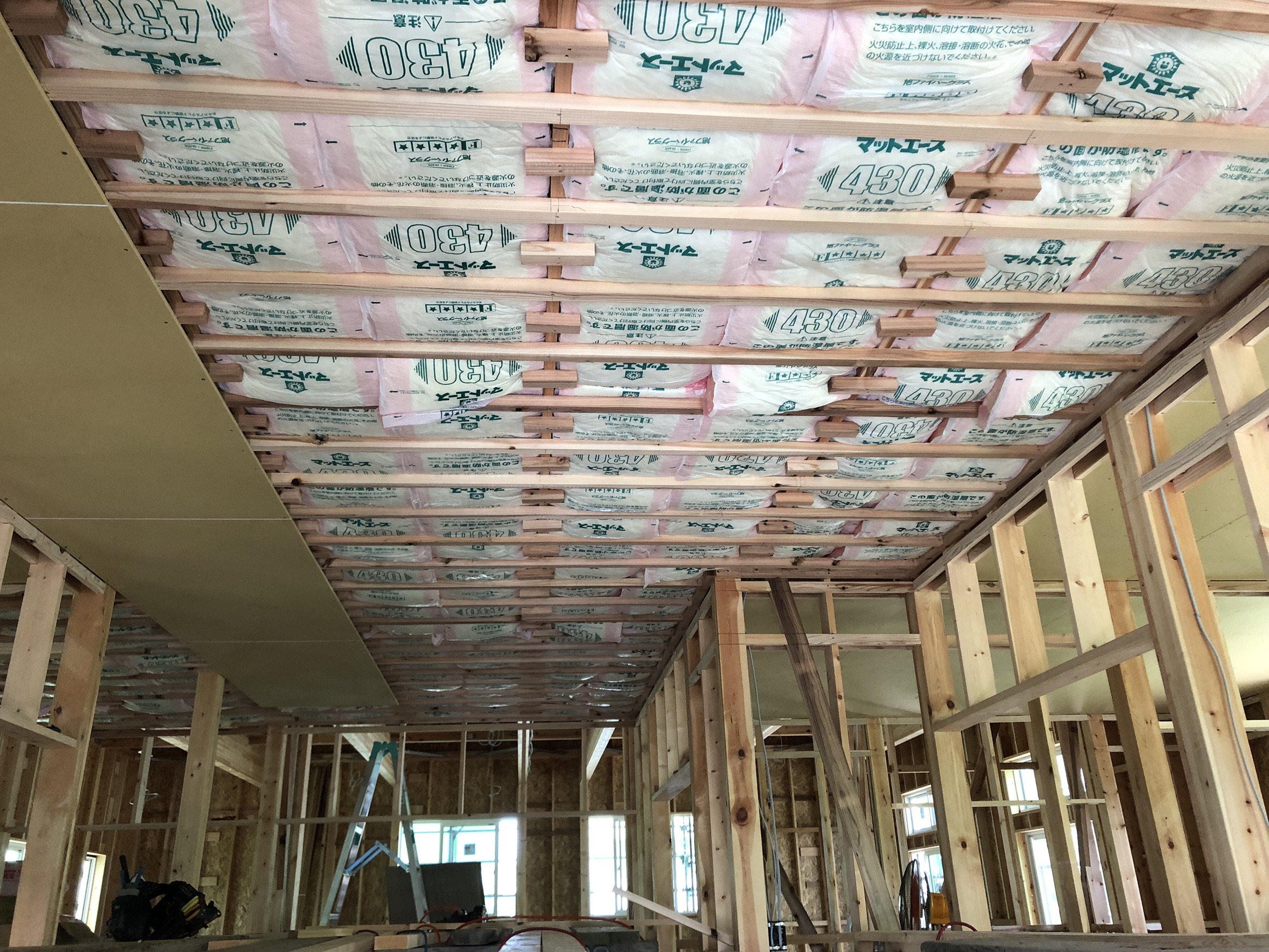 天井と壁面にマットエース430というグラスウール製の断熱材を設置し、石膏ボードで蓋をしていきます。マットエースの防湿フィルムは簡単に剥がすことができ幅詰めも容易にできることから、写真のように隙間なく施工することが可能です。